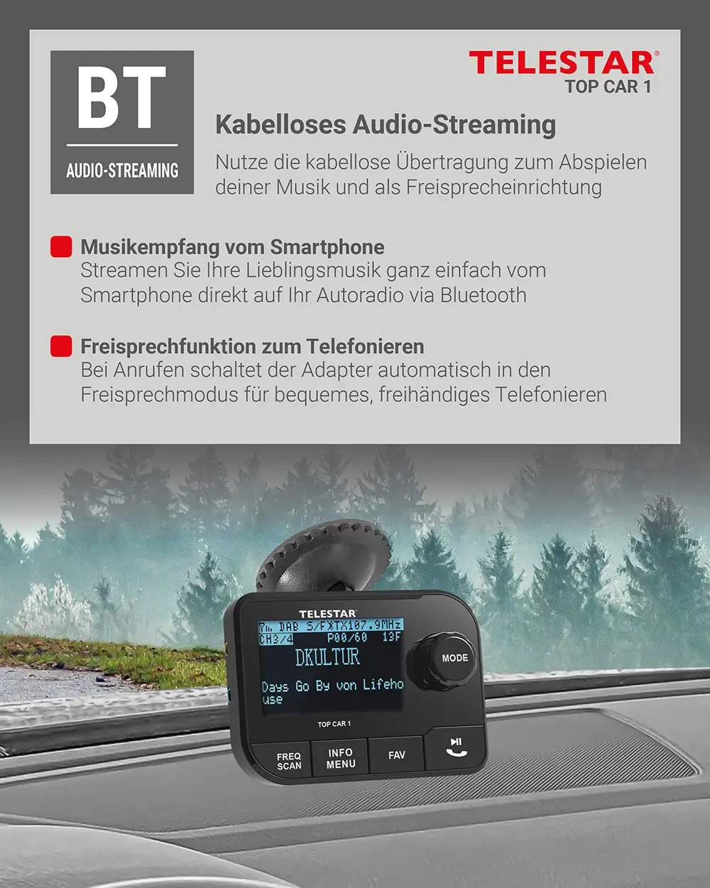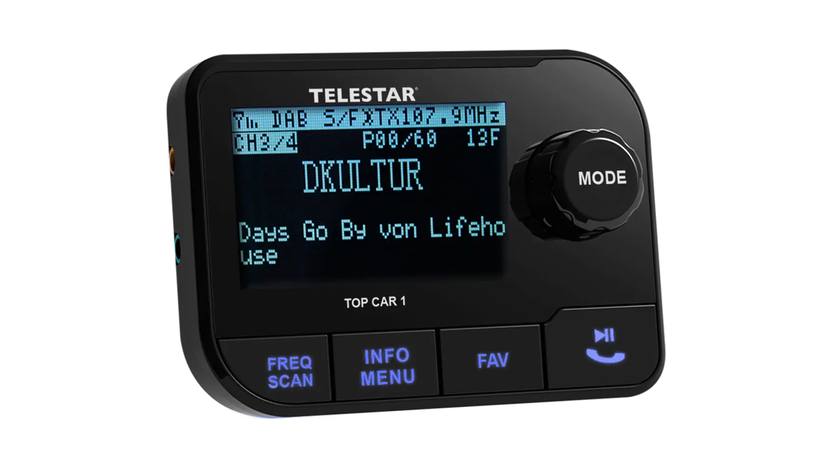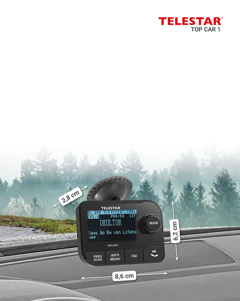 Der TELESTAR TOP CAR 1 ist ein kompakter DAB+ Auto Adapter, der modernen Digitalradio-Empfang und Bluetooth-Funktionen in Fahrzeuge ohne DAB+ integriert – ganz ohne aufwendige Umbauten. Über DAB/DAB+ genießen Sie kristallklaren digitalen Radioempfang und können bis zu 60 Lieblingssender speichern.